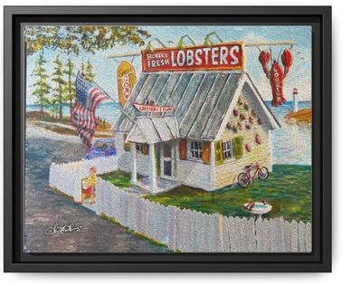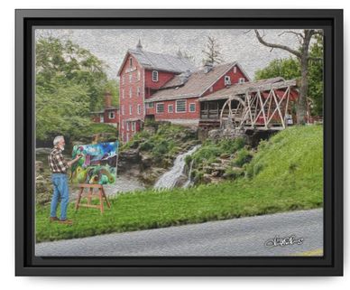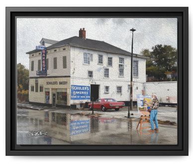 John painted an original acrylic on canvas board as an 11” x 14” vertical. This particular image features that original image appearing to be painted plein air in front of the Schuler’s Bakery building. This final image was created by the use of AI (artificial intelligenc), Photoshop, and years of experience.